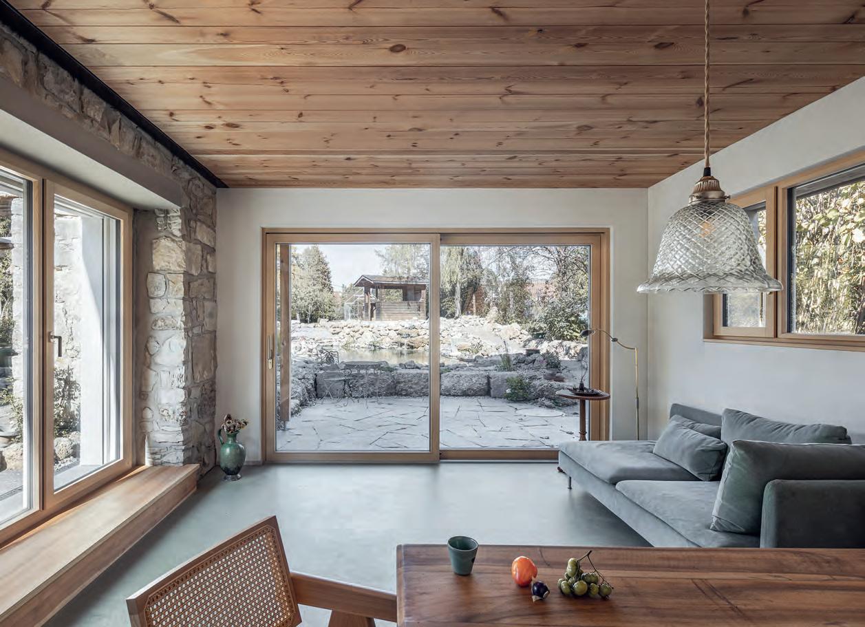 Grosse Fensteröffnungen und ein nahezu stufenloser Übergang geben die Aussicht Richtung Norden zum Schwimmteich und nach Westen in den Hofgarten frei.