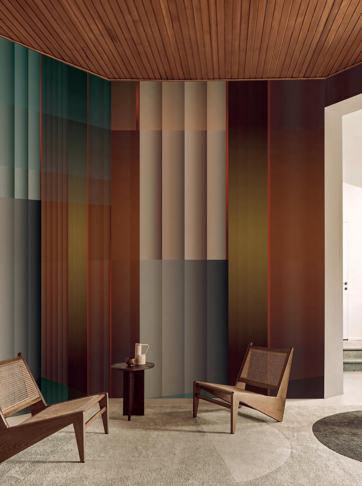 Die Tapete «Parallel Tinct» von Mae Engelgeer verbindet grafische Klarheit mit nachhaltiger Materialität. Gedruckt auf d.ecodura™ , dem ersten organischen Bio-Vinyl-Tapetensubstrat, ist sie wahlweise mit edlem Stoff-Effekt oder glatter, sandartiger Oberfläche erhältlich. www.wallanddeco.com