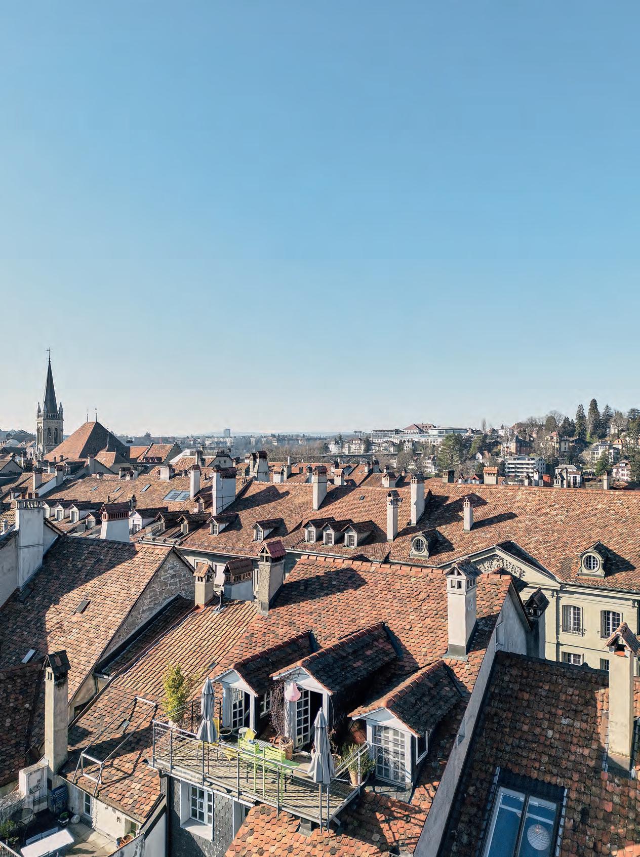 40 Über den Dächern von Bern. Der Architekt Bernhard von Erlach hat das Dachgeschoss eines Berner Altstadthauses in einen lichtdurchfluteten, gemütlichen Rückzugsort verwandelt.