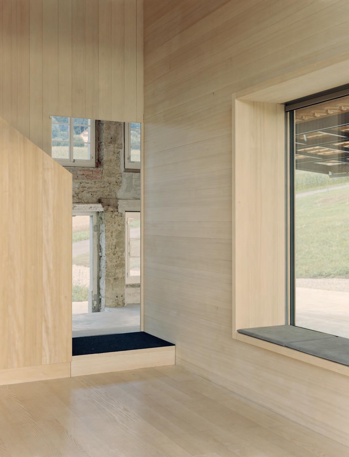 2 Reizvoll Die homogenen Fichtenholzoberflächen stehen im starken Kontrast zur aussen liegenden Schicht.