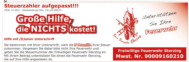 Sie bestimmen mit Ihrer Unterschrift, wem die 0 Ihrer Steuer :zukommen. Vergessen Sie dabei bitte nicht Ihre Feuerwehr und geben Sie die Steuernummer der Freiwilligen Feuernrehr Sterzing an. Mit Ihrem Beitirag unterstützen Sie direkt die Feuerwehr Ste-rzing, die auf Ihre Hilfe angewiesen ist.