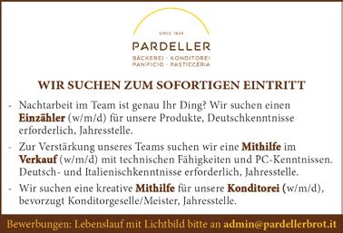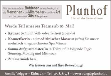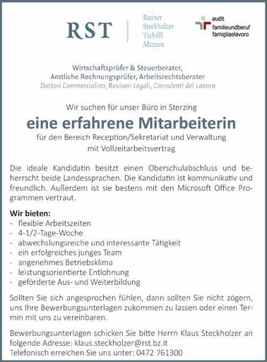 Wir suchen zuverlässige, volljährige Student/in für die Leitung der Elki-Sommerspielgruppen in den Monaten Juli und August 3-4x wöchentlich vormittags. Bewerbungsunterlagen bitte an sterzing@elki. bz.it. Weitere Infos erhältlich Montag und Dienstag vormittags unter Tel. 0472 768067. Rezeptionistin mit ASA-Kenntnissen gesucht. Parkhotel Zum Engel****, Sterzing, Fini@zum-engel.it oder Tel. 335 285875. Zur Verstärkung des Teams suchen wir einheimischen Baggerfahrer oder Mitarbeiter, der das Baggerfahren lernen möchte. Gute Entlohnung und Firmenfahrzeug wird geboten. Tel. 347 7104276, sillergabriel@gmail.com