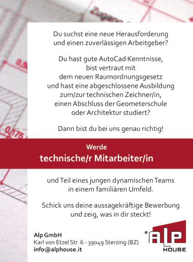 Du hast gute AutoCad·Kenntnisse, bist vertraut mit dem neuen Raumordnungsgesetz und hast eine abgeschlossene Ausbildung zum/zur technischen Zeichner/in, einen Abschluss der Geometerschule oder Architektur studiert?