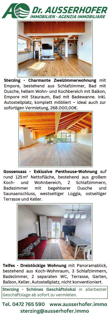 Appartement , 90 qm, mit Terrasse und Abstellraum, in romantischer Umgebung ab August 2025 in der Gemeinde Freienfeld zu vermieten. Zuschriften mit vollständigem Namen und Telefonnummer an die Erker-Redaktion, Neustadt 20A, Sterzing, E-Mail: barbara. fontana@dererker.it, Tel. 0472 766876. Kennwort: WOHNUNG FREIENFELD.