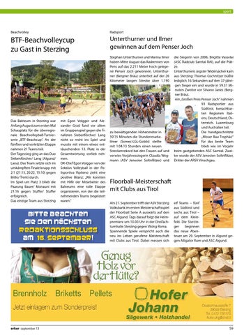 mit Egon Volgger und Alexander Grasl fand vor allem im Gruppenspiel gegen die Finalisten Siebenförcher/ Lang nicht so recht ins Spiel und musste mit einem etwas enttäuschenden 13. Platz in der Gesamtwertung vorlieb nehmen. OK-Chef Egon Volgger von der Sektion Volleyball in der Polisportiva Vipiteno zieht eine positive Bilanz: „Wir konnten mit Hilfe der Mitarbeiter des Balneums eine tolle Etappe organisieren, von der die teilnehmenden Teams begeistert waren.“
