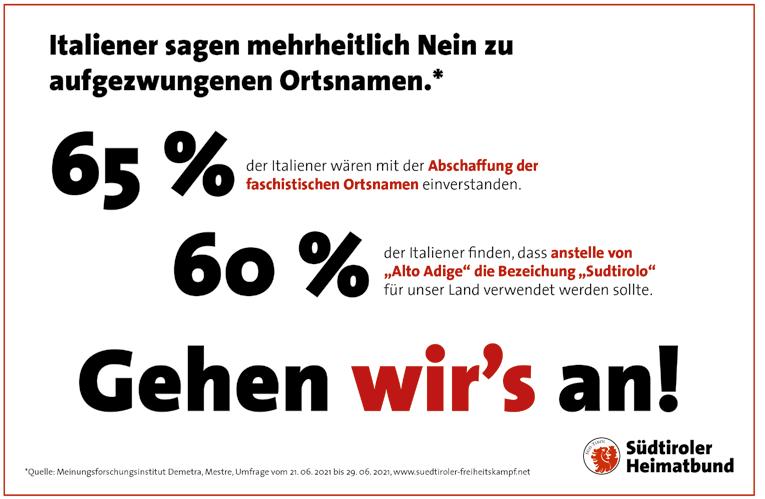 „Wären Sie damit einverstanden, wenn, anstelle des für die Autonome Provinz Bozen verwendeten Namens „Alto Adige“, offiziell im Italienischen der authentische Name „Sudtirolo“ verwendet würde?“ 60 % der Italiener in ganz Italien antworten darauf mit „Ja“.