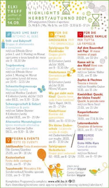 beiteten ehrenamtlich mit, Land, Bürgermeister und Bezirkspräsidenten gewährten Beiträge. Aus dem „Elki Sterzing“ wurde das „Elki Wipptal“, da viele Mitarbeiter und Mitglieder auch aus den umliegenden Gemeinden kamen. Mittlerweile gibt es das ganze Jahr über Kinderbetreuung und einen Tauschmarkt, wo Kinderkleidung, Spiele und vieles mehr aus zweiter Hand gekauft werden kann. „Am schönsten ist der Garten“, schwärmt Rosa Obexer. „Er ist das Herzstück des ElKi und der Stadt Sterzing.“ Ein Teil davon wäre beinahe in eine Straße verbaut worden. „Wir haben uns erdreistet, Unterschriften zu sammeln, und konnten den Garten gerade noch rechtzeitig retten“, ergänzt die ehemalige ElKi-Vorsitzende Gudrun Schiefer. Nicht jedes ElKi habe das Glück, einen Garten für Feste und andere Veranstaltungen nutzen zu können, über die ein großer Teil der Einkünfte generiert werden kann. Die Innenräume mit Bauraum, Kreativraum, Stube und Turnraum werden im Winter und bei schlechtem Wetter genutzt.