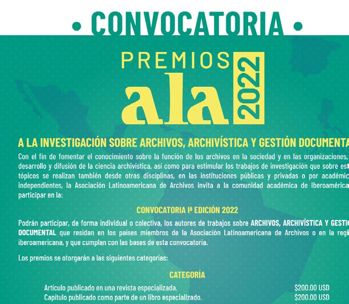La Asociación Latinoamericana de Archivos (ALA) los invita a participar en la convocatoria “Premios ALA 2022 a la Investigación sobre Archivos, Archivística y Gestión Documental”, donde se fomentará el conocimiento sobre la función de los archivos, tanto en la sociedad como en las organizaciones; así como, el desarrollo y difusión de la ciencia archivística a fin de estimular los trabajos de investigación. Podrán participar, de forma individual o colectiva, los autores de trabajos sobre Archivos, Archivística y Gestión Documental que residan en los países miembros de la Asociación Latinoamericana de Archivos. La convocatoria estará habilitada hasta el 31 de diciembre de 2022. La publicación de los resultados será el 15 de marzo de 2023 a través del sitio web de la ALA. Consulta la bases en: https://www.alaarchivos.org/premiosala/ Más información...