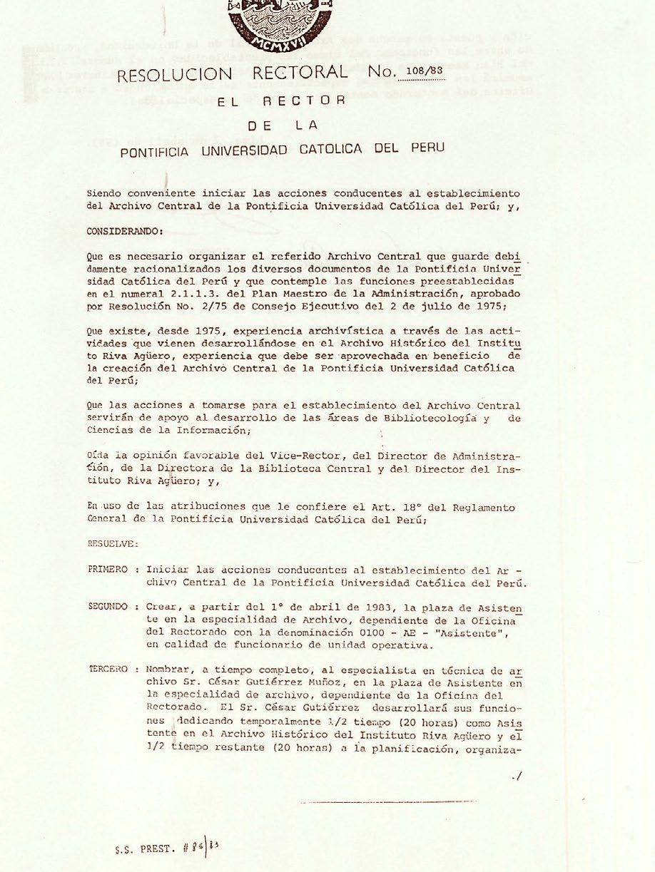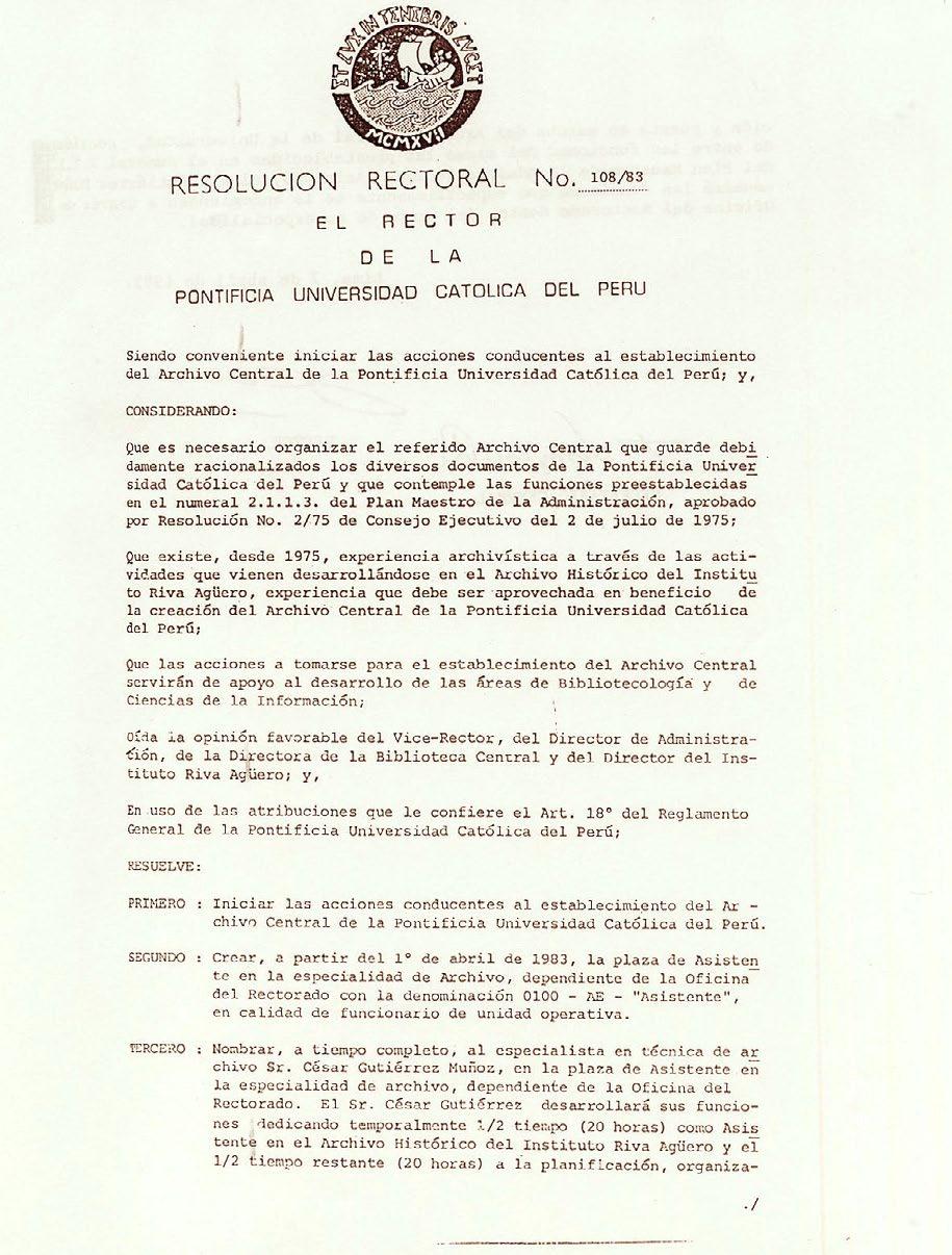 Después de 66 años de funcionamiento de la Pontificia Universidad Católica del Perú y ante la necesidad de centralizar los documentos que se iban produciendo, el 7 de abril de 1983 se promulgó la Resolución Rectoral N° 108/83 que dispuso dar inicio a las acciones conducentes al establecimiento del Archivo de la Universidad. Asimismo, dicha resolución resolvió en su artículo 2° crear la plaza de Asistente en la especialidad de Archivo, dependiente de la Oficina del Rectorado. Por último, se nombró al señor César Gutiérrez Muñoz en la referida plaza, quien se encargó de la planificación, organización y puesta en marcha del Archivo Central de la Universidad.