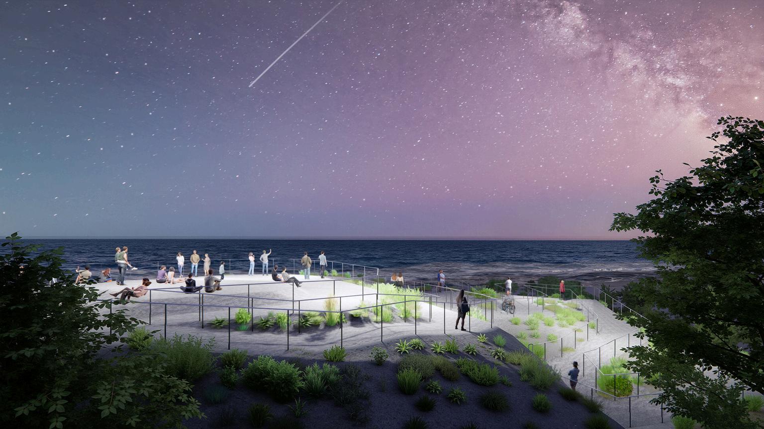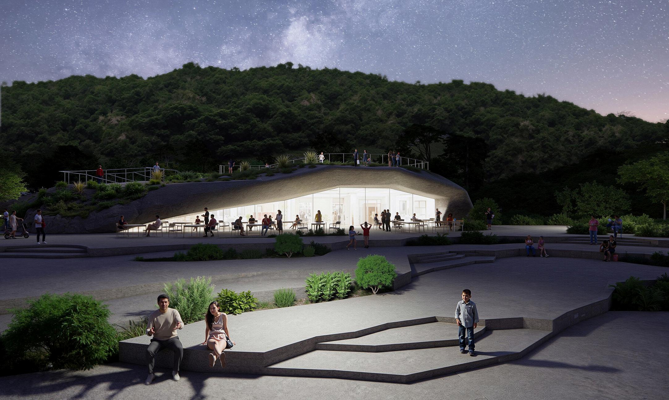 Plantings follow a gradient strategy: dense, tall native species near the forest transition to low, salt-tolerant vegetation closer to the sea. Even the concrete surfaces of the buildings are designed to be colonised by moss and small plants over time, creating a living, evolving architecture that harmonises with its surroundings. At the park entrance, three sculptural rock-like buildings welcome visitors The largest contains a visitor centre, café, and souvenir shop; a second hosts exhibitions and environmental education; the third provides restrooms. Roof terraces offer stargazing and panoramic coastal views. The surrounding landscape of plateaus and plazas invites gatherings, markets, and quiet appreciation of the scenery.
