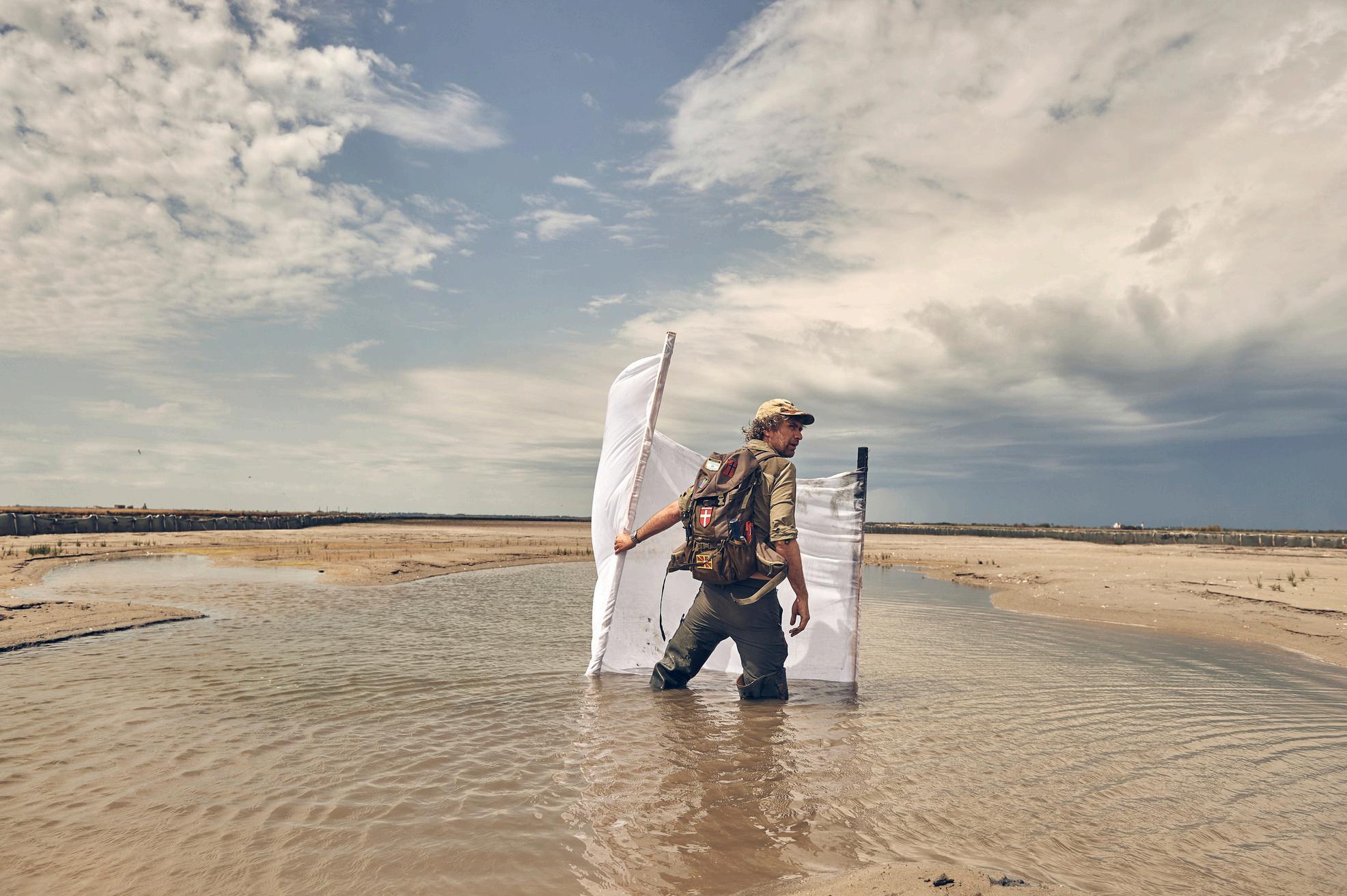 Roberto Ghezzi, Installation for the creation of a lagoon Naturography on silk, 2022, 200 x 200 cm