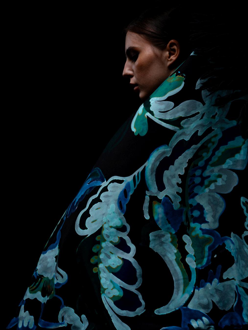 A fine relief print overlays the jacquard, creating a subtle echo of the underlying pattern a reflection of embroidery reimagined through avant-garde textile printing