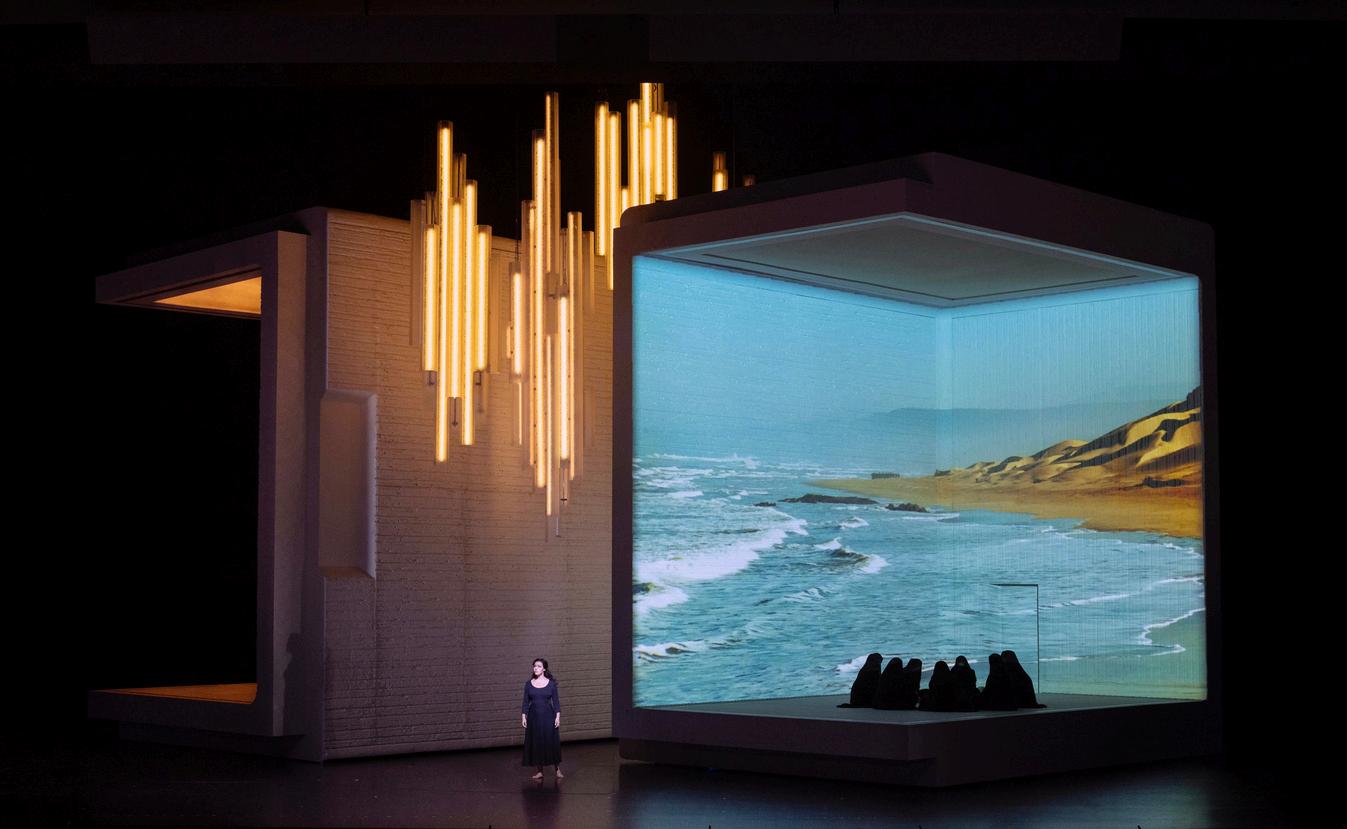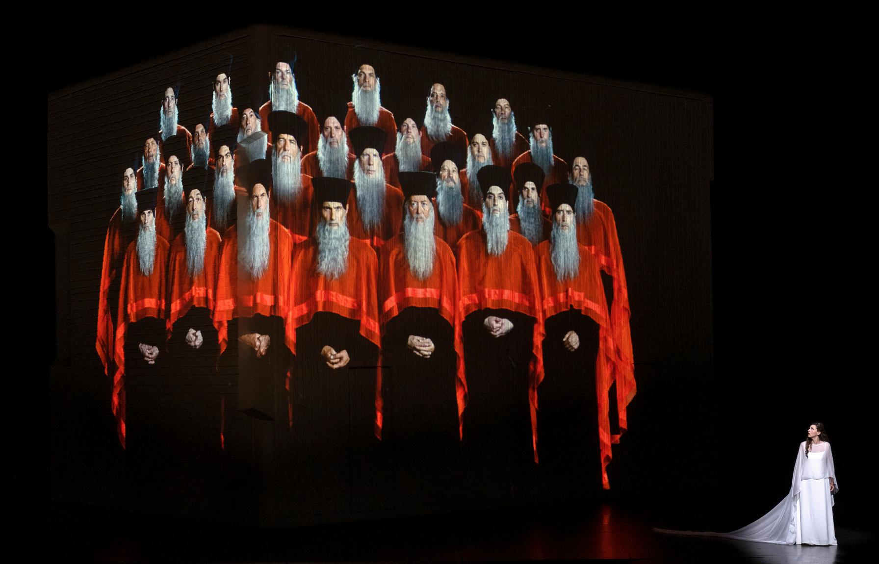 The production also responds to contemporary debates around gender and identity. Inspired by the Iranian “Woman Life Freedom” movement, Neshat has removed the veiled imagery previously associated with female characters. The Ethiopian women, including Aida herself, are now portrayed as modern women, distinct from the Egyptians, highlighting their agency and individuality.