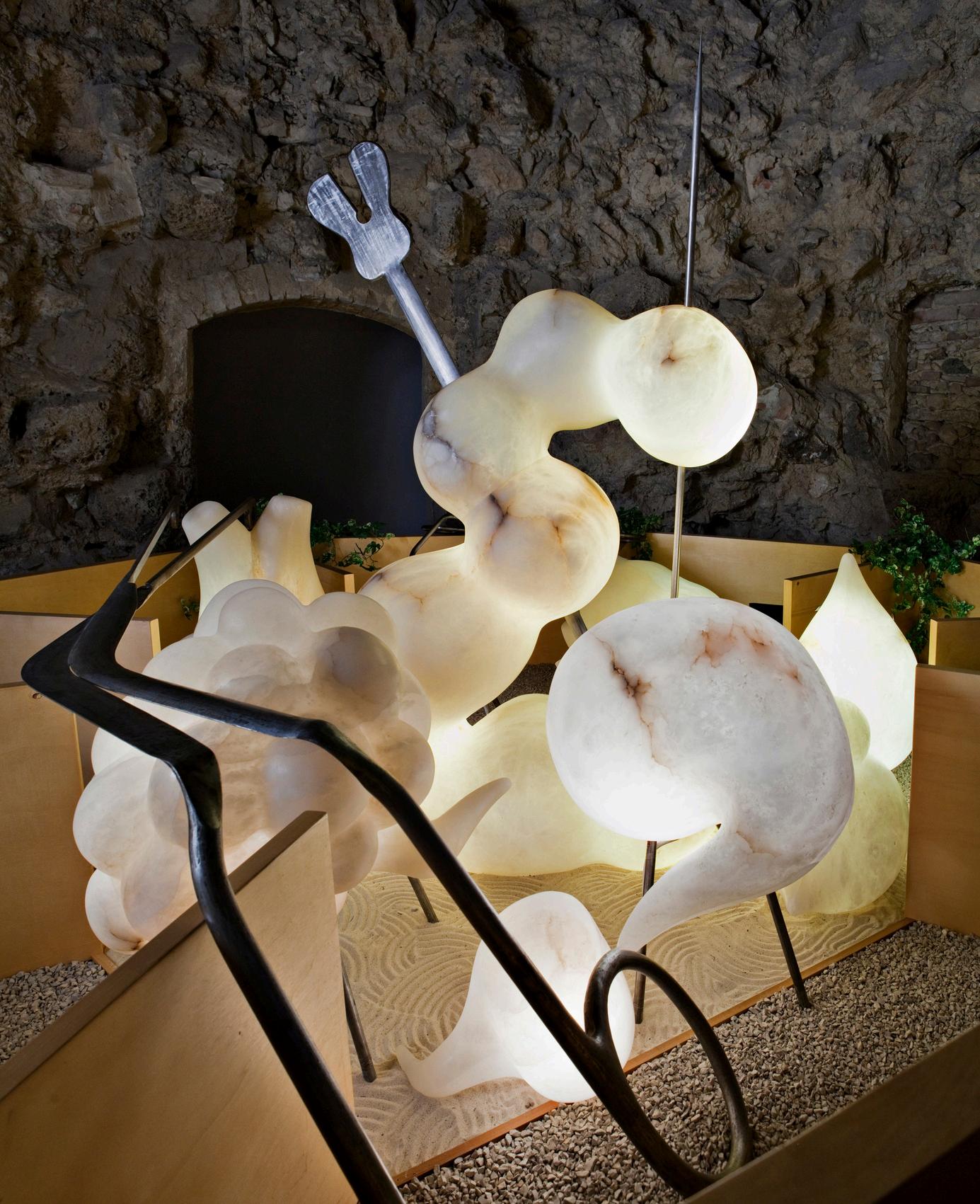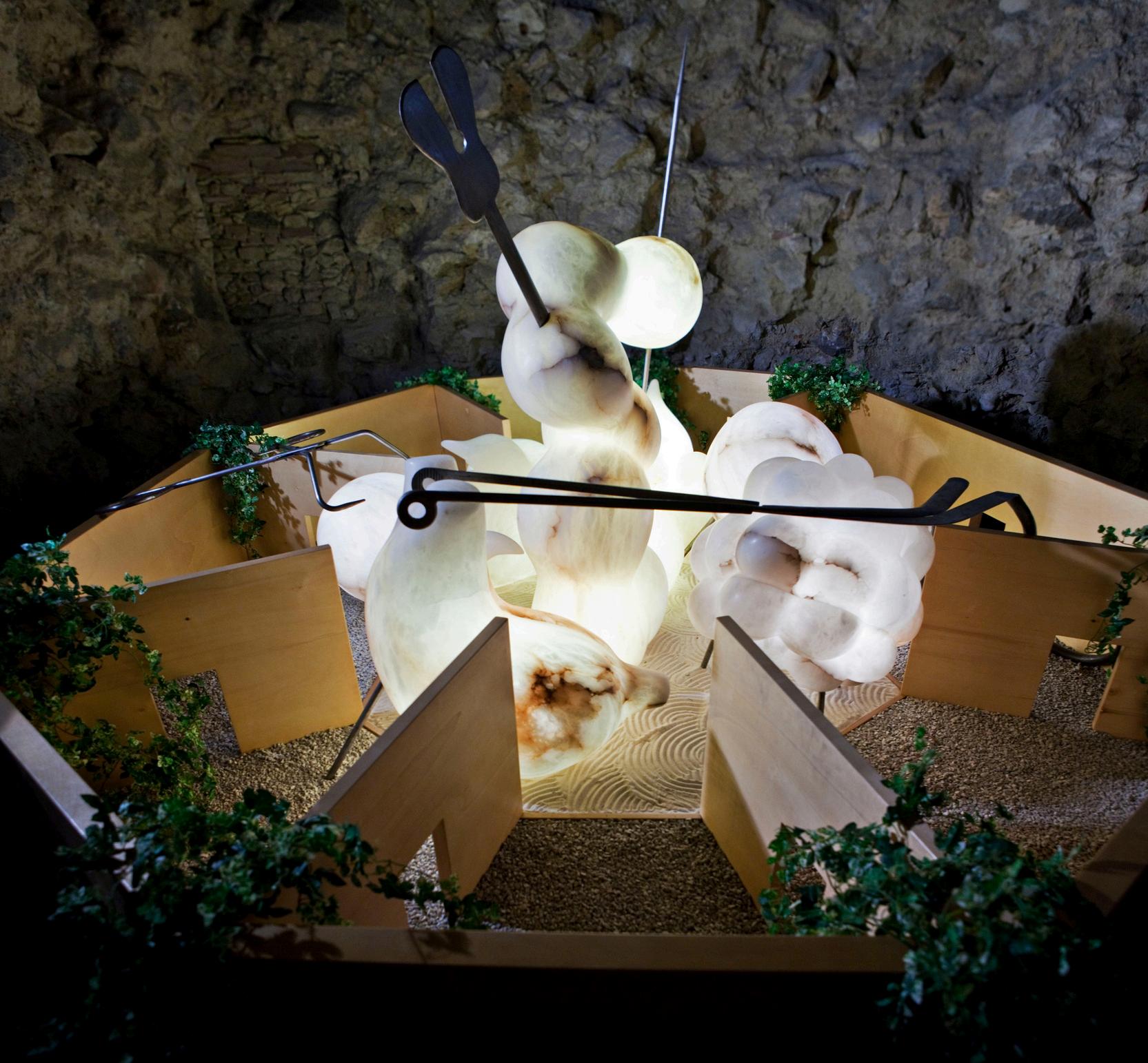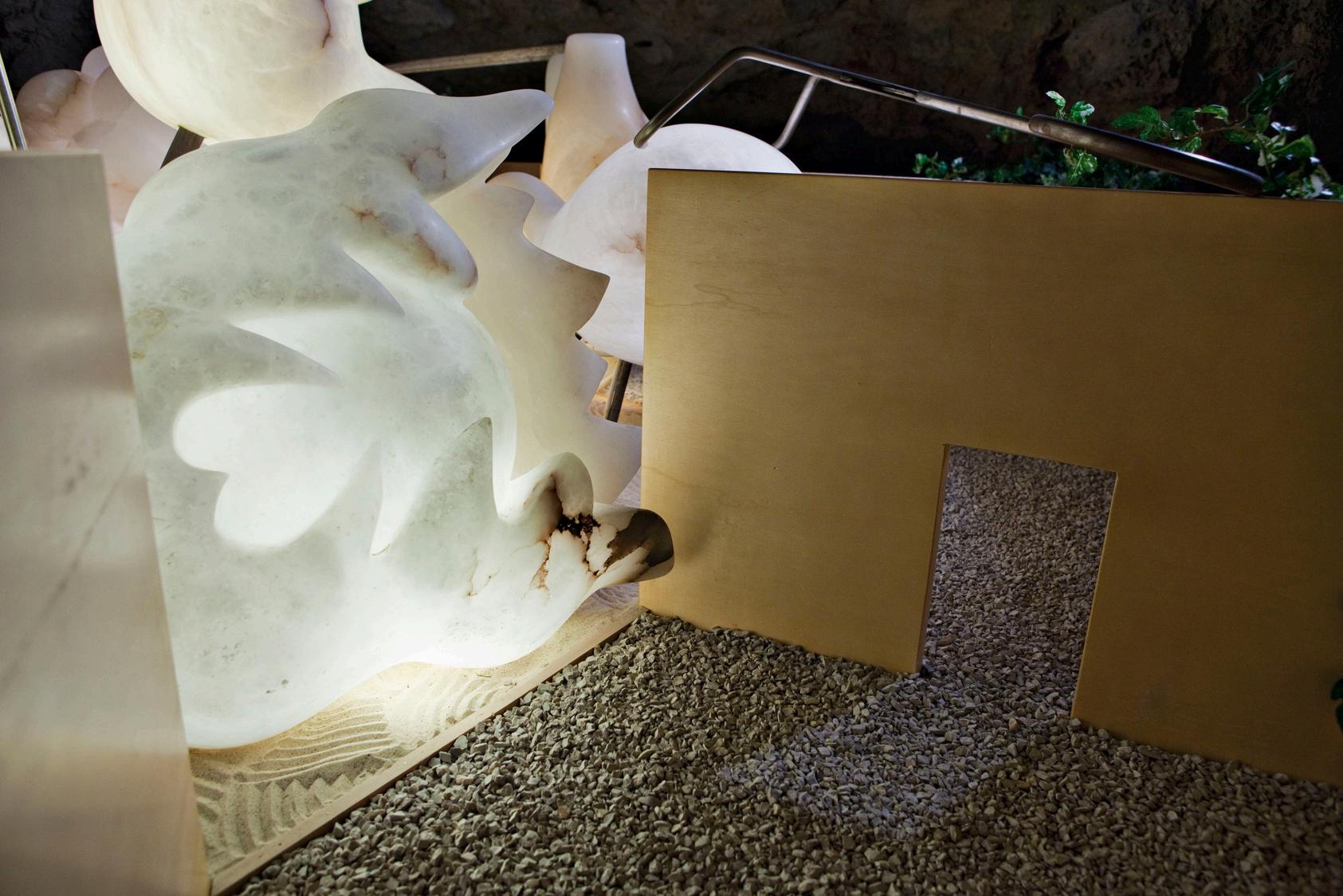 Chen Zhen, Zen Garden (2), 2000, Alabaster, metal, wood, sand, small stones, light bulbs, plastic plants, 175 x 340 x 300 cm, Courtesy: GALLERIA CONTINUA, Photographer: Ela Bialkowska