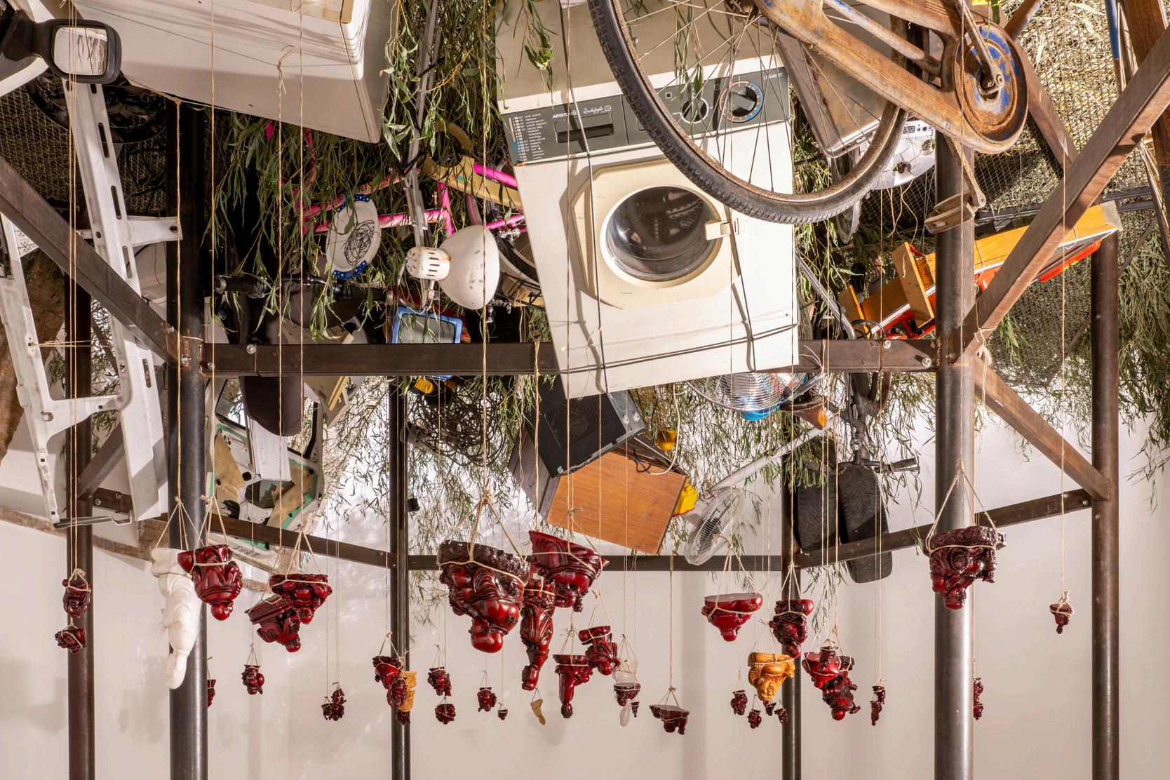 Chen Zhen, Fu Dao / Fu Dao, Upside-down Buddha / Arrival at Good Fortune, 1997 metal, bamboo, Buddha Statues, found objects, string, 500 x 800 x 650 cm (approx.),