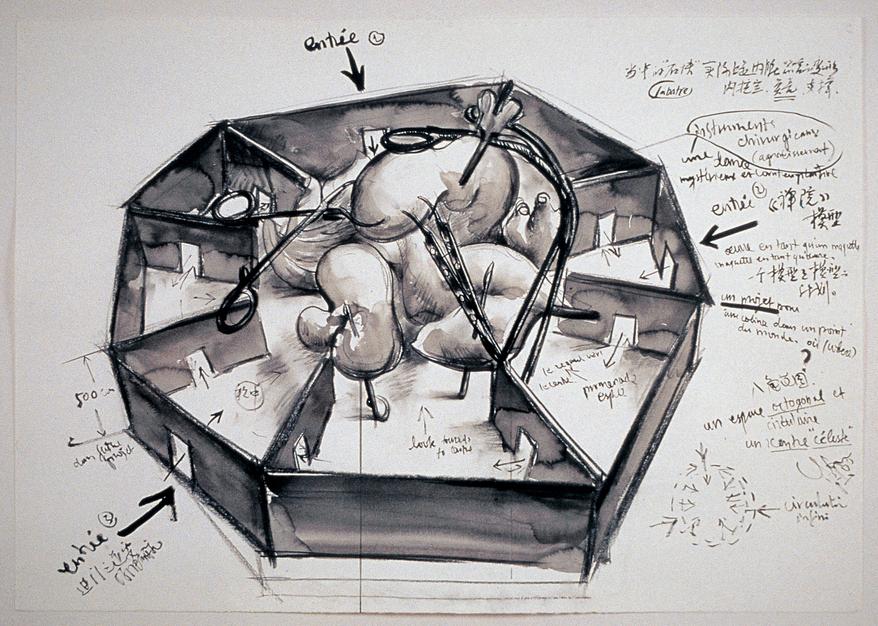 Chen Zhen, Projet mental pour 'Zen Garden', n 4, 2000, Collage, India ink, black, blue and red ball-point pen, ribbon and correction fluid on paper, 100 x 70 cm, Courtesy: GALLERIA CONTINUA