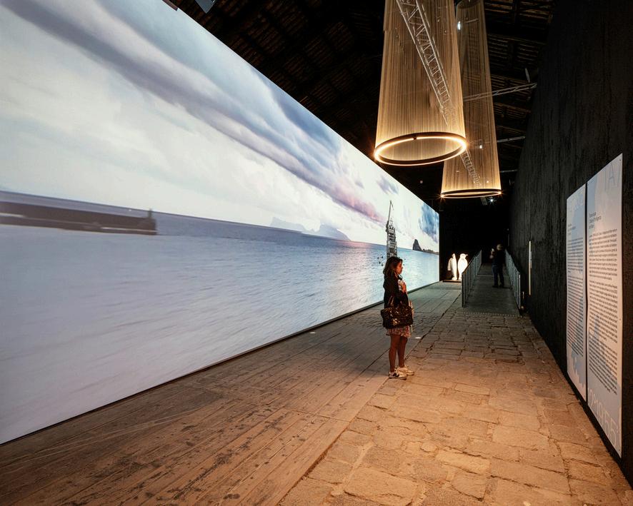 The exhibition design, conceived by Guendalina Salimei, physically translates the concept of the threshold. Upon entering, visitors encounter a Bicephalous Wall a large structure made of tubular frames and canvases that cuts through the space like a cliff On one side flow images of Italy seen from the sea, with all its beauty and fragility; on the other, a nineteenth-century-style gallery gathers maps and drawings of an Italy that is possible, visionary, and future-oriented. On the short side of the Tesa, a LED wall projects completed and ongoing projects, while Via Maris, the filmic work by Francesco de Melis, created with the Central Institute for Intangible Heritage, accompanies the viewer on an immersive journey through Italy’s maritime civilization.