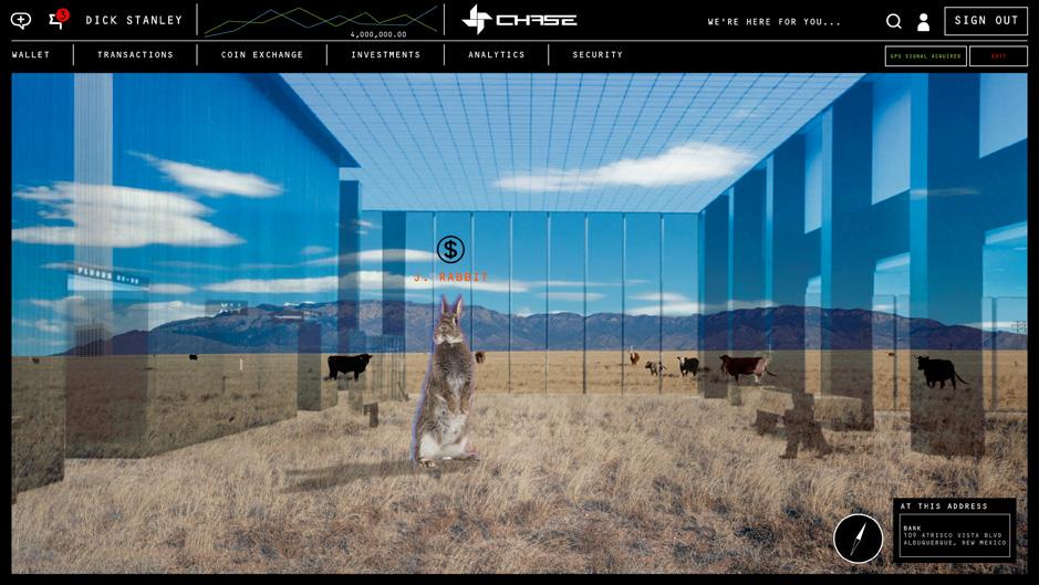 David Bers, of David Bers Architecture, took inspiration from SOM’s Chase Manhattan Bank 6 , completed in 1961 and demolished in 2021 to clear space for Chase’s new headquarters. His proposal is a virtual reconstruction of that building “populated by spirits of Albuquerque’s indigenous animals, who play the role of surrogate guides for Mr. Stanley in an interactive bank experience.” (The fauna are in response to JPMorgan Chase’s lounge in Decentraland, which hosts a roaming tiger, in addition to a portrait of Dimon.) The VR experience would be accessible only when the user is physically on-site in the desert. As one moves through the ghostly architecture, the apparitions play the role of bankers: The “spirit animals” will be “portkeys” that, upon approach, unlock “various sensory media experiences of banking.”
