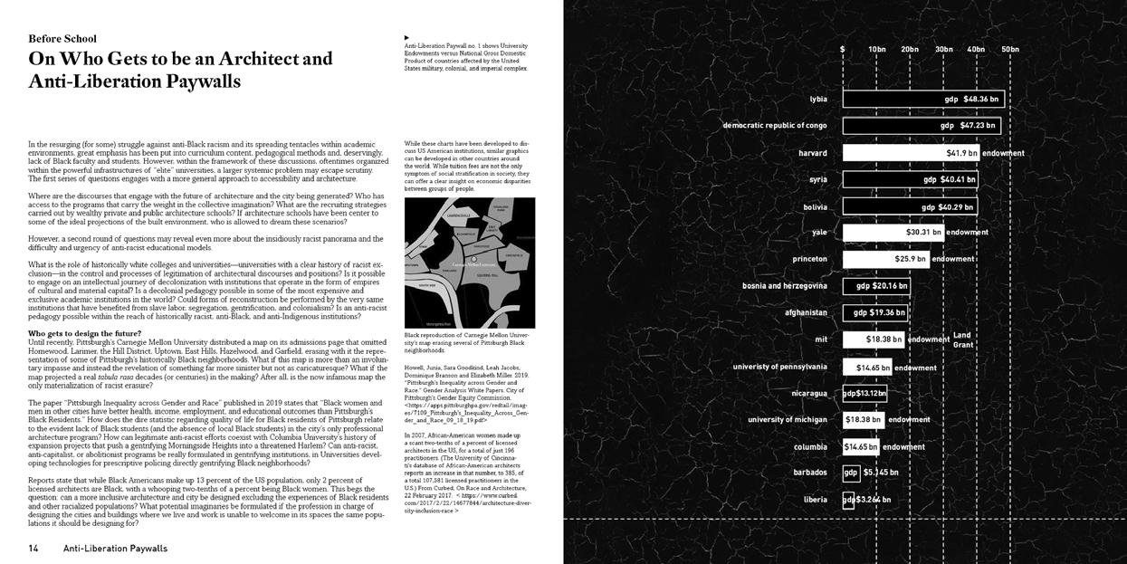 In the first chapter, “Before School: On Who Gets to Be an Architect and Anti-Liberation Paywalls,” the Manual unveils systemic barriers to entry, contrasting tuition fees for elite architectural institutions across the United States with median household incomes in their respective cities, as well as endowments compared with the GDPs of entire nations. This chapter builds off the stark simplicity of this material stratification to demonstrate that not only do universities perpetuate exclusion along lines of class and race but they themselves are settler-colonial tools of land occupation, gentrification, and racial oppression.