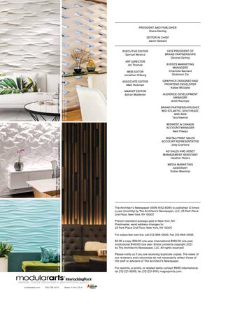 Presort-standard postage paid in New York, NY. Postmaster, send address changes to: 25 Park Place 2nd Floor, New York, NY 10007. For subscriber service: call 212-966-0630. Fax 212-966-0633. $3.95 a copy, $39.00 one year, international $160.00 one year, institutional $149.00 one year. Entire contents copyright 2021 by The Architect’s Newspaper, LLC. All rights reserved. Please notify us if you are receiving duplicate copies. The views of our reviewers and columnists do not necessarily reflect those of the staff or advisers of The Architect’s Newspaper. For reprints, e-prints, or related items contact PARS International, tel 212-221-9595; fax 212-221-9191; magreprints.com.