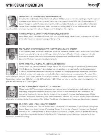 SYMPOSIUM PRESENTERS CRAIG SCHWITTER | BUROHAPPOLD | MANAGING PRINCIPAL Craig Schwitter established BuroHappold’s first U.S. office in 1999 because of his interest in providing an integrated approach to engineering and planning across disciplines. The firm has grown to a staff of over 200 in five U.S. offices including NY, Boston, Chicago, LA and San Francisco. Working with world-renowned architects, the firm has solved the most complex high performance engineering problems. Recent successes include the topping off of PNC Bank Headquarters, the first naturally ventilated commercial skyscraper in the U.S. and the opening of the third phase of the Highline. AARON SEWARD | THE ARCHITECT’S NEWSPAPER | EXECUTIVE EDITOR Aaron Seward is AN’s Executive Editor and the Editor of its Southwest edition. He has 14 years of experience as a journalist and an editor focusing on architecture, design, and engineering.