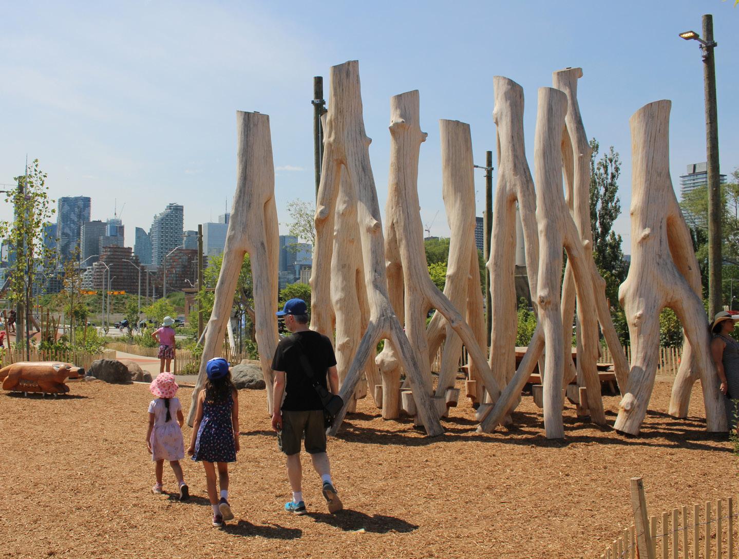 project—the decades-long effort to renaturalize the mouth of the Don River, deliver flood protection, and provide spaces for living and recreation, at an overall cost of about $1 billion USD. But for those arriving later in the afternoon, as I did, one could be forgiven for thinking that it had long been part of our city. I entered the park through its northern edge, just south of Commissioners Street, to find that people were making it their own: Kids were climbing the already famous Snowy Owl Theatre and sliding down zip lines; others were busy in the many designated fishing areas; and a small crowd gathered by a paddleboat launch location.