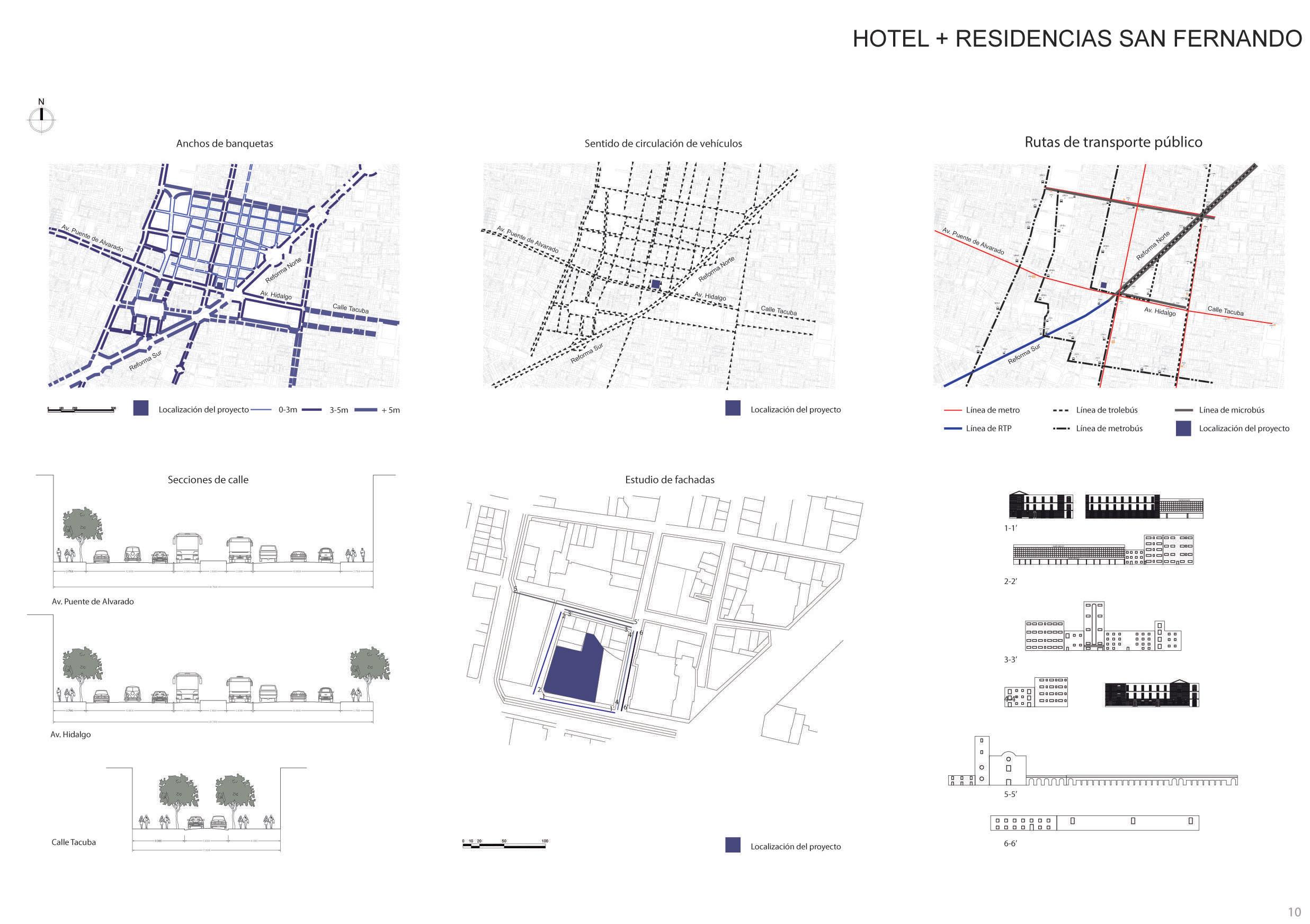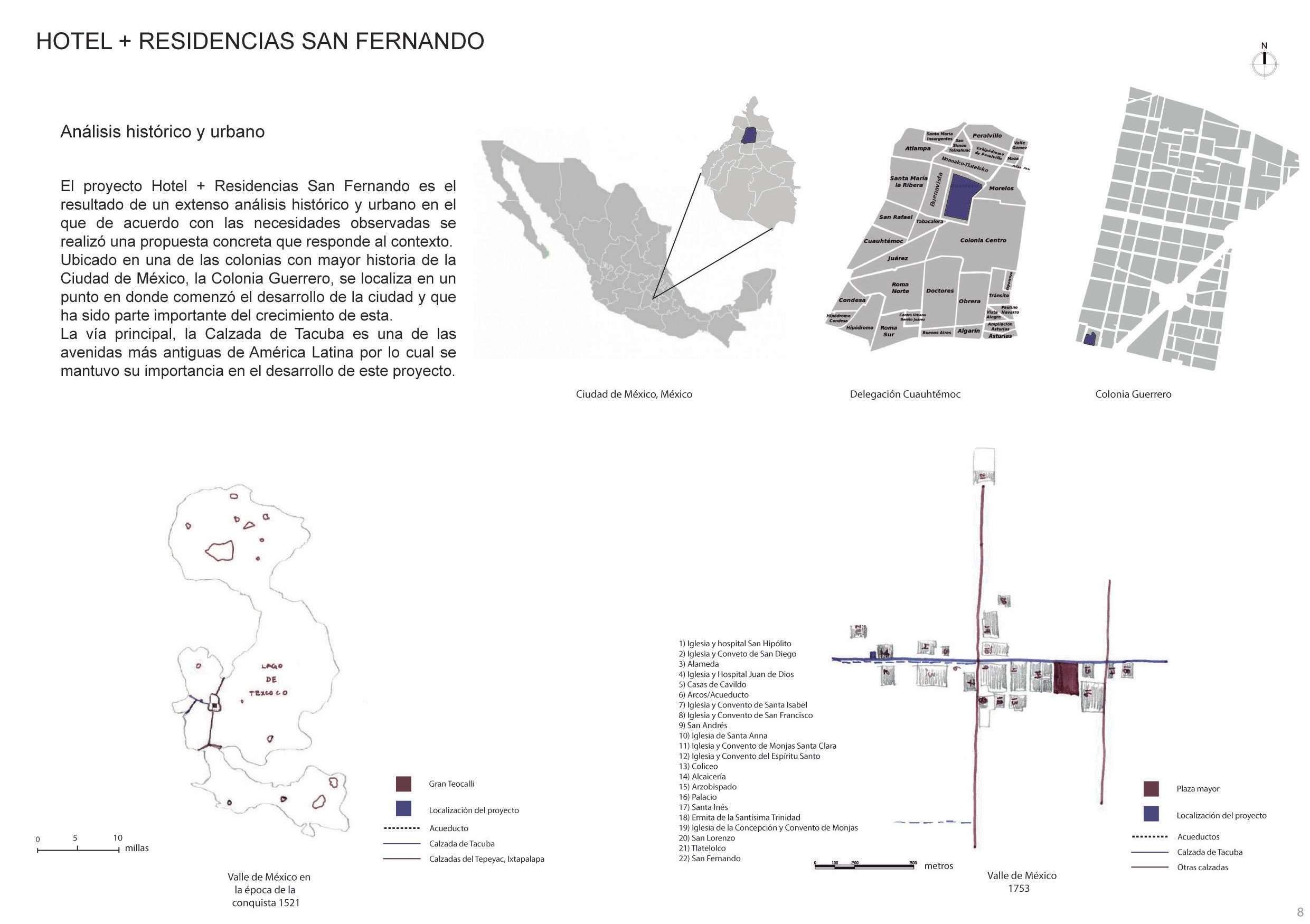 La Calzada de Tacuba, una de las avenidas más antiguas de América Latina fue perdiendo su protagonismo y se convirtió en un eje vial transformándose en una barrera urbana para los peatones. Pese a tener un uso de suelo variado en donde predomina el comercio y la vivienda, la Colonia Guerrero ha quedado marginada y se vive un ambiente de inseguridad a pesar de contar con monumentos históricos como el Panteón San Fernando, lugar en donde se encuentran sepultados algunos ex presidentes y figuras importantes de la historia de México; el comercio ambulante, centralizado principalmente en las paradas del transporte público, reduce de manera drástica el espacio de las banquetas generando una circulación complicada para los transeúntes. Pese a todo esto, al ser un área localizada en el centro de la ciudad, se encuentra muy bien comunicada con las principales líneas de metro, metrobús y microbús; de igual manera, al realizar el estudio de las fachadas, la gran mayoría conserva su aspecto histórico creando una armonía y una imagen visual agradable. El día 28 de octubre se celebra el Día de San Judas, una tradición donde miles de fieles de toda la República Mexicana asisten al Ex Convento de San Hipólito a rendirle culto a San Judas Tadeo, el “patrono de las causas perdidas”. La gran mayoría de las personas que asisten a esta peregrinación es gente de clase socioeconómica media-baja y se reúnen en las calles aledañas al templo, que se encuentra a escasos metros de donde está ubicado el proyecto Hotel + Residencias San Fernando, en la entrada sur de la Colonia Guerrero. Debido a esta tradición, cada día 28 del mes asisten fieles al templo, siendo el 28 de octubre el día principal de esta tradición.