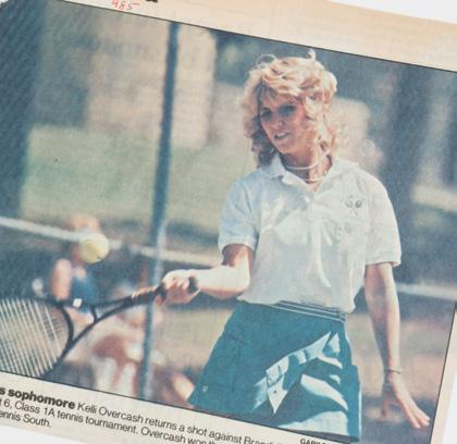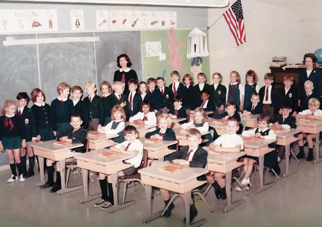 THE ORIGINAL SCHOOL UNIFORMS, adopted in 1965, included dark green skirts and green wool blazers. The athletic teams and cheerleaders took the field in green and white uniforms and fans cheered the Saints on while waving green pennants and pompoms.