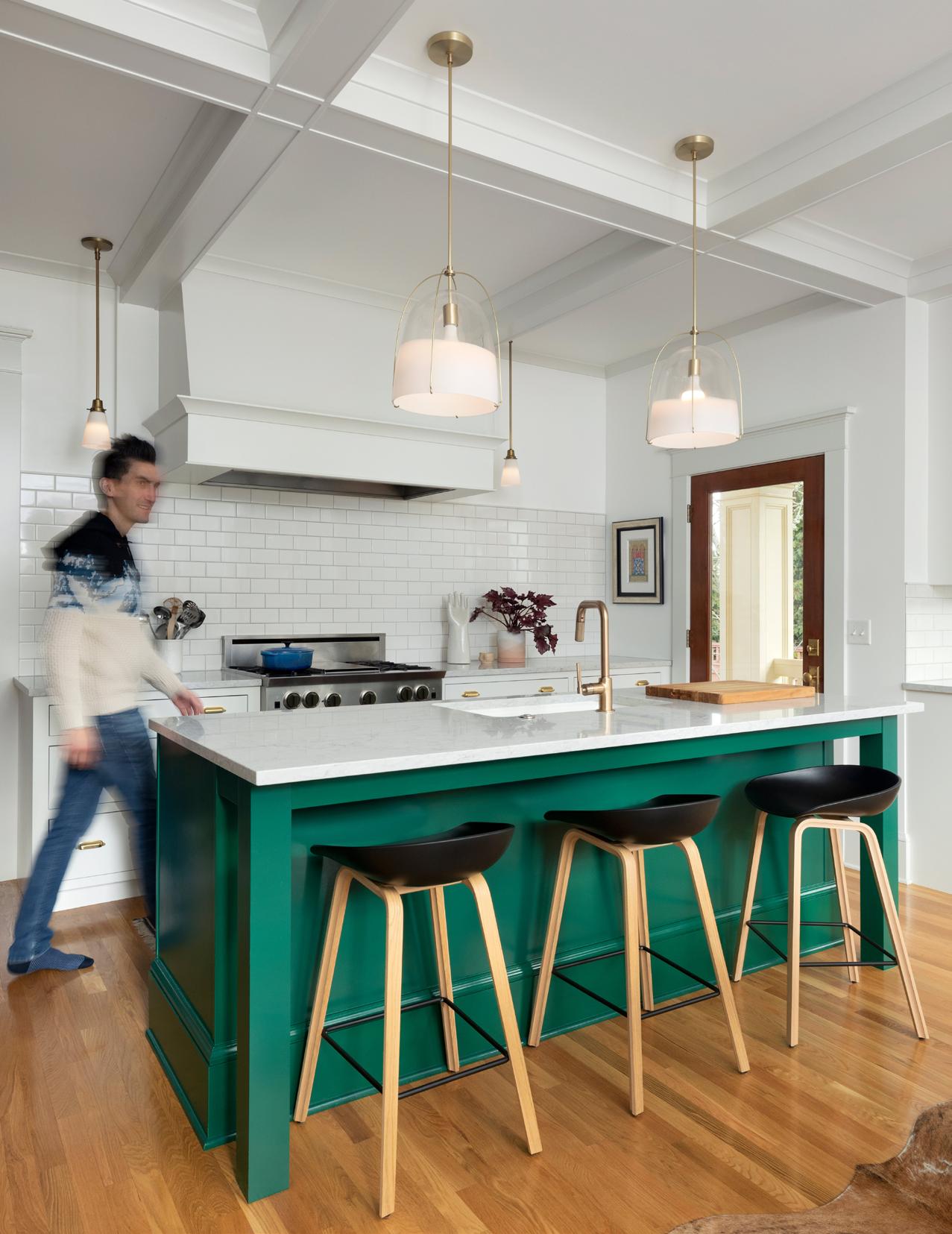 New box beams and a custom jewel-toned island hide structure and dress up function. Custom cabinets by Versatile Wood Products