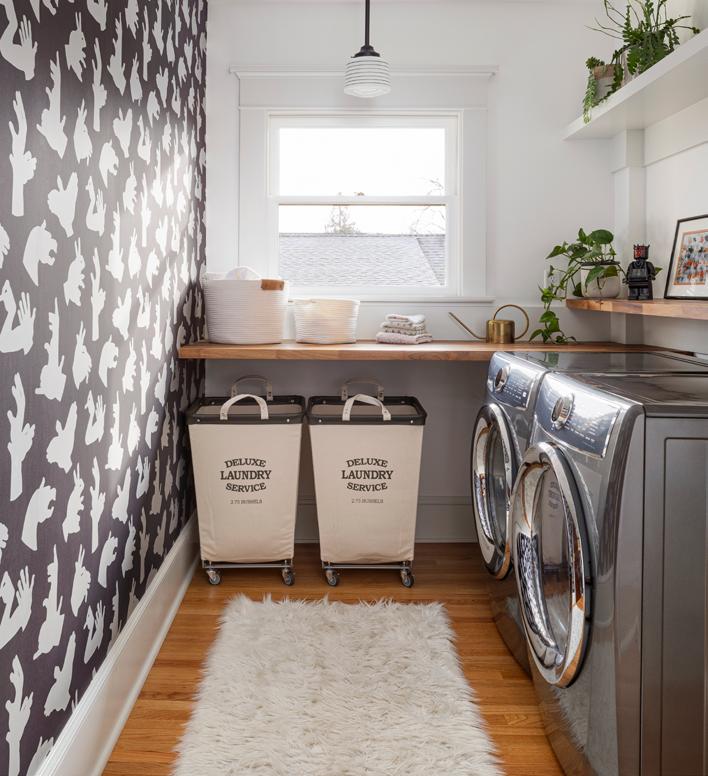 LEFT: The new laundry gives plenty of room to sort and fold, with lovely natural light and lively wallpaper. Custom window by Versatile Wood Products
