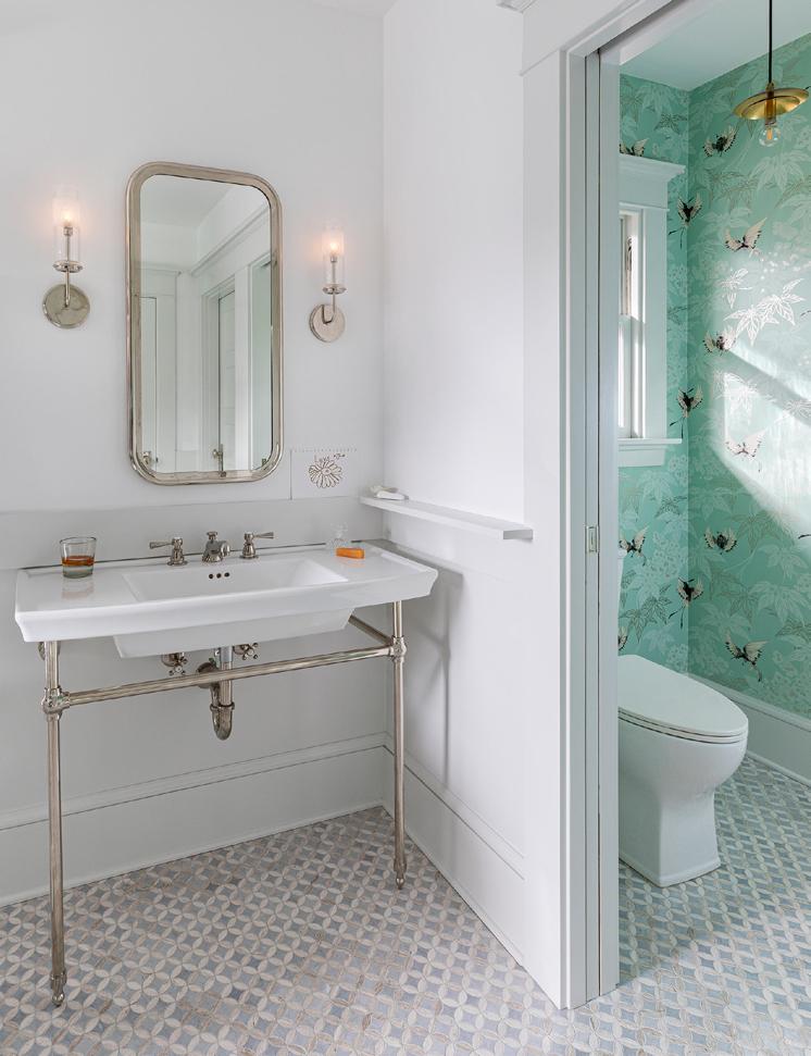 The new WC feels fun and exotic with green wainscoting and playful wallpaper.