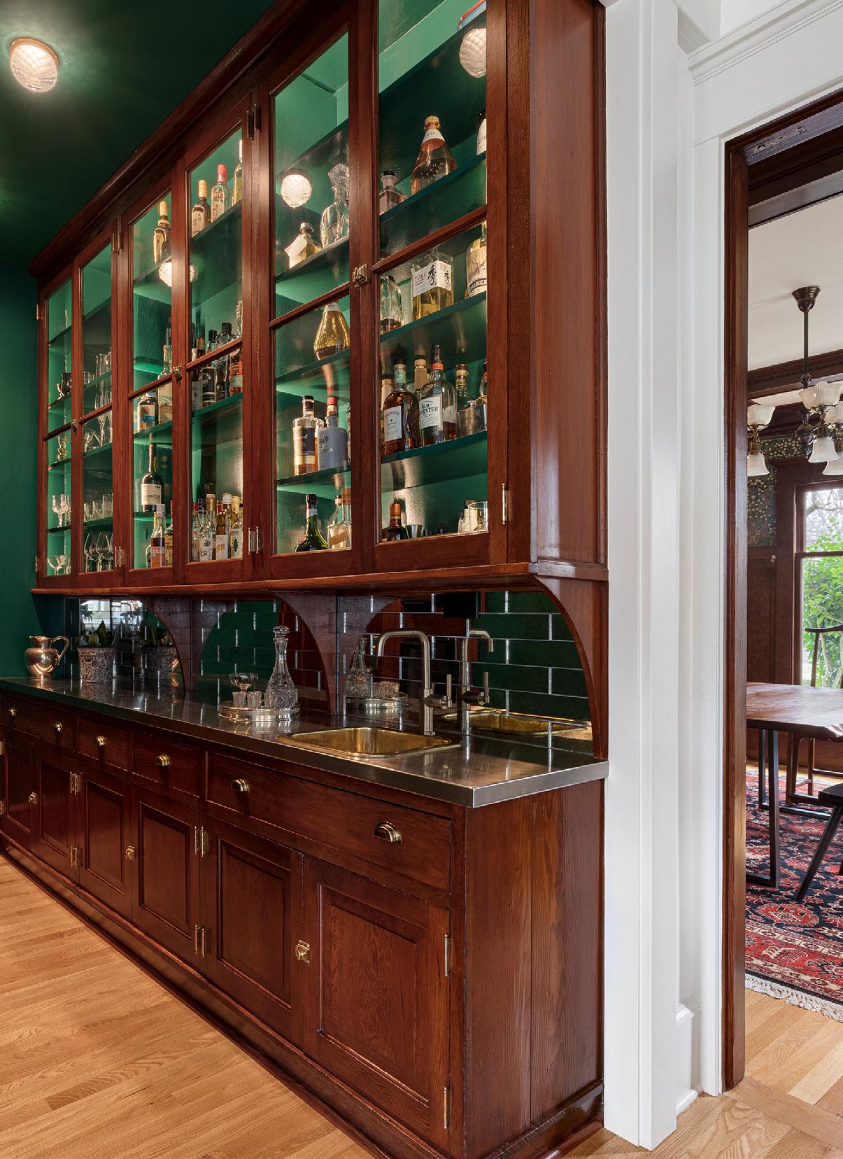 Just off the kitchen, we turned the built-in butlers pantry cabinets into a wet bar.