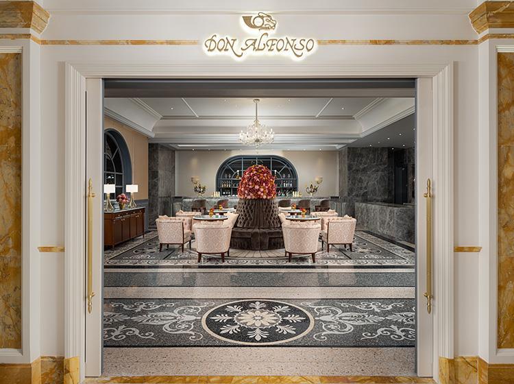 The Mesa, a modern Portuguese restaurant located within the hotel and led by the esteemed chef Jose Avillez, offers a lavish dining experience with a Great Gatsby-inspired atmosphere. The decor features stunning black and gold interiors, glistening mosaics, sleek marble, unique hanging bird cages, and intricate geometric patterns. The main attraction of the restaurant is the advanced LED ceiling that mimics a starry sky, providing a delightful experience of dining under the stars.
