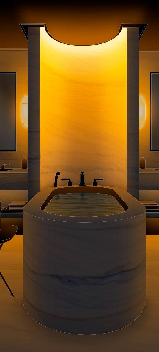 en este caso en particular, el uso de las calas curvas de iluminación realza el protagonismo dado por las texturas (mármol) aportadas por los interioristas.