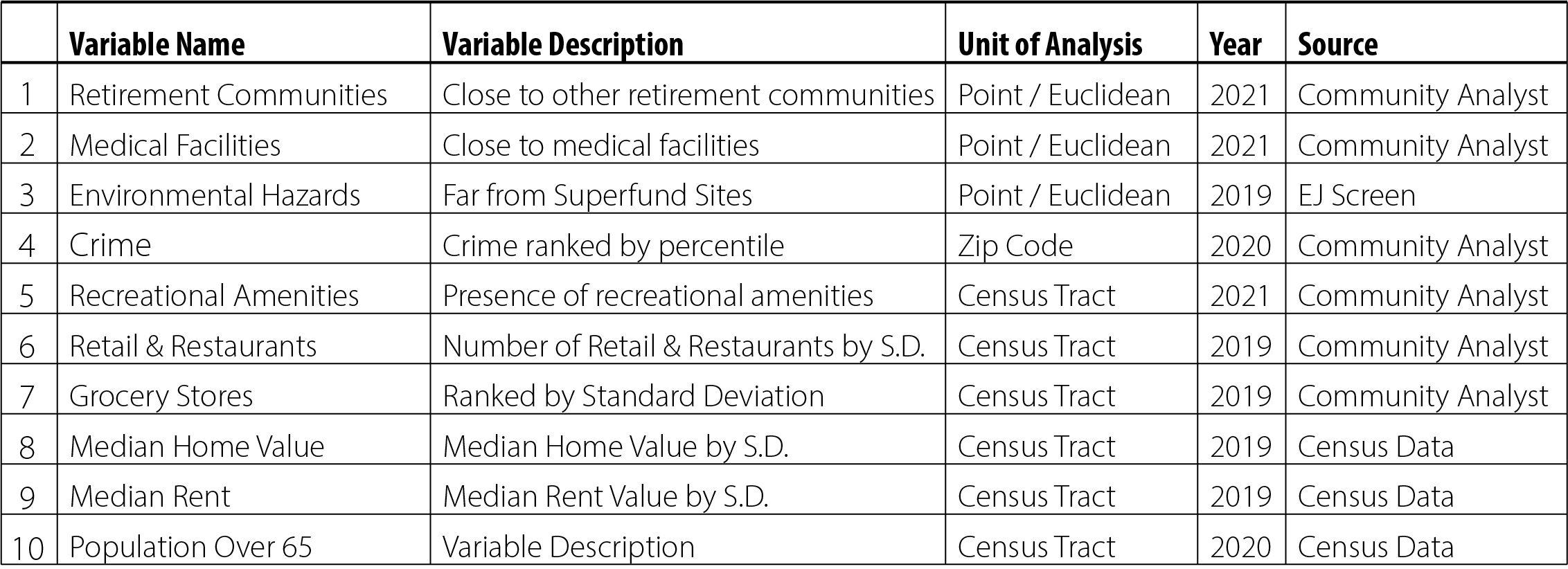 Scattershot Approach 1. Zoning 2. Available Parcels 3. Existing Retirement Communities 4. Medical Facilities 5. Environmental Hazards 6. Crime 7. Transit Stops 8. Cultural Amenities