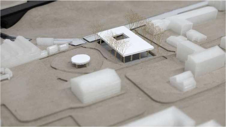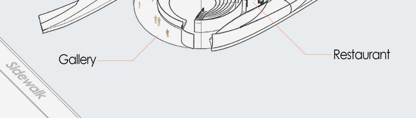 4-A ramp starting from the open exhibition and aligning with the location of trees and park routes connects the building to the