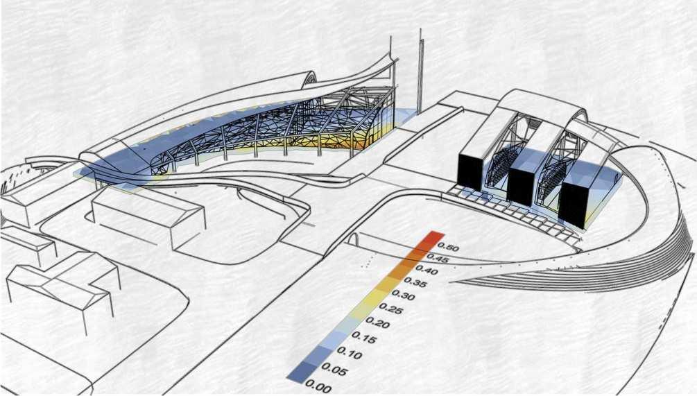 The glass facade was analyzed using Grasshopper's Ladybug plug-in, revealing low radiation levels (0.42 KWh/m²) and minimal impact on temperature.