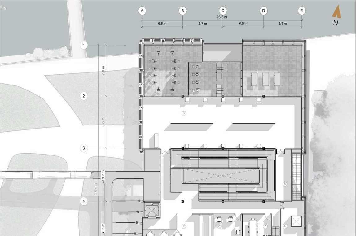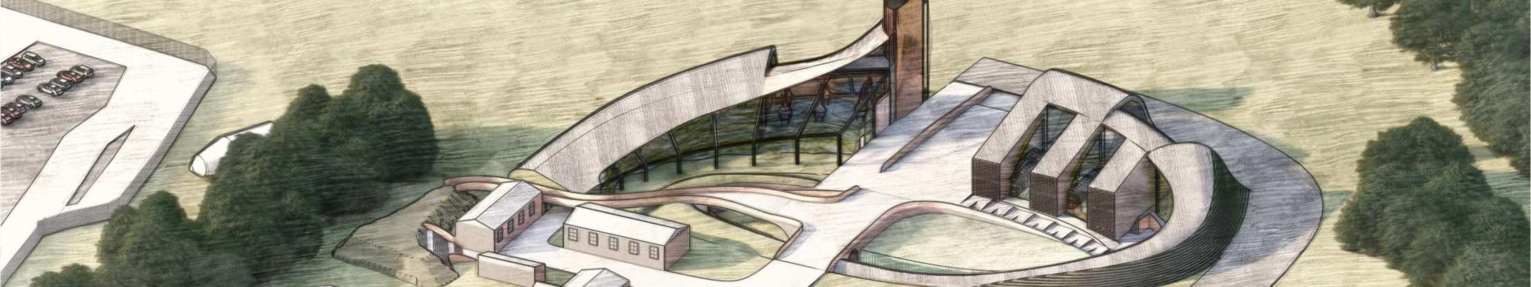 2. To formally connect the distillery with the existing buildings, a profile was created considering the adjacent building's section and in response to the noise coming from the airport
