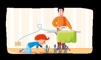 Il papà stira. Andrea gioca con i soldatini.
