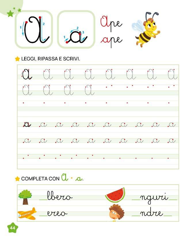 Pagine di scrittura chiare e graduali sempre basate sul rigo per favorire la chiarezza ed evitare confusione nei bambini.