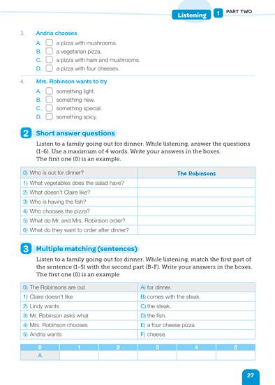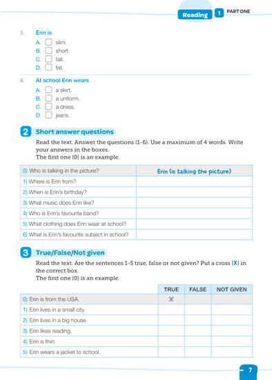 Le 6 esercitazioni della prima parte consentono di esercitarsi per la prova di reading attraverso la lettura di un brano della lunghezza massima di 110 parole al quale sono associate domande di comprensione (da un minimo di 3 a un massimo di 8).