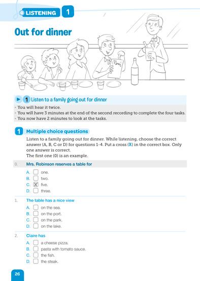 Listen to a family going out for dinner. While listening, answer the questions (1-6). Use a maximum of 4 words. Write your answers in the boxes. The first one (0) is an example.