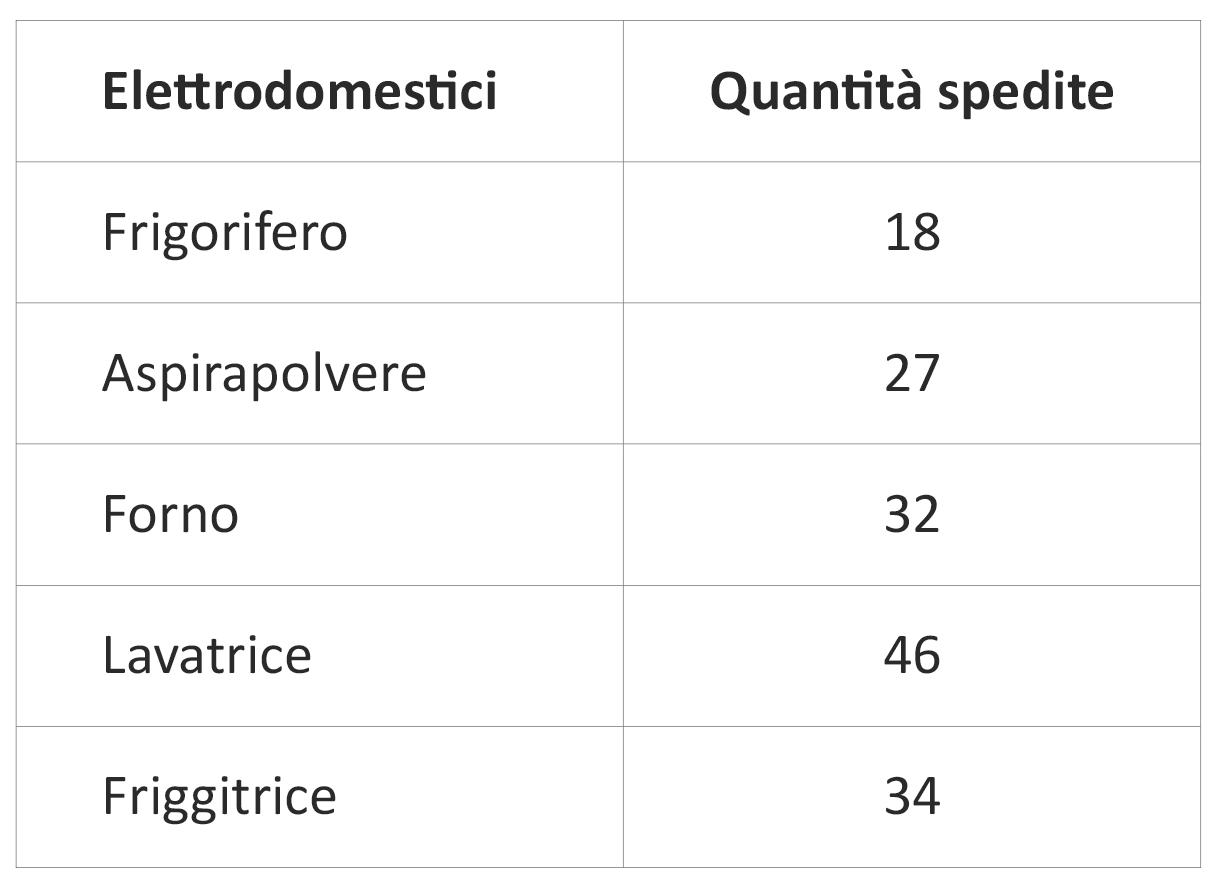 La tabella mostra quanti elettrodomestici sono stati spediti da un magazzino in giornata.