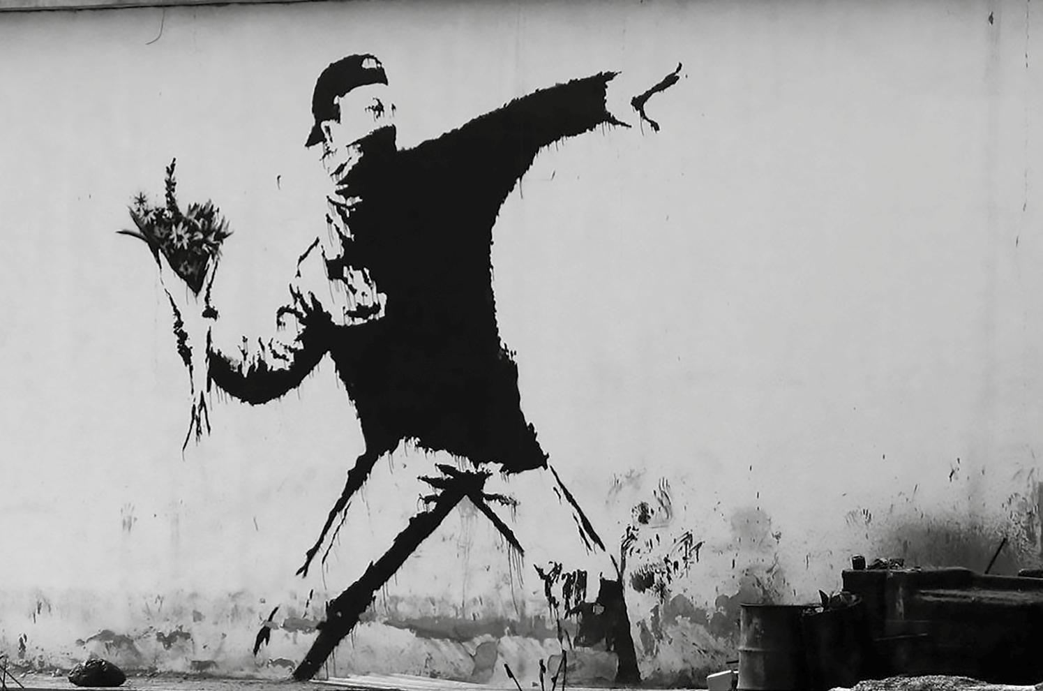 Banksy, la cui identità è avvolta nel mistero, è nato in Inghilterra ed è considerato uno dei maggiori esponenti della street art. Le sue opere sono a sfondo politico e sociale. Quella che vedi qui riprodotta è Flower Thrower, alta 5 metri e realizzata a Gerusalemme, sul muro che separa Israele dalla Palestina.
