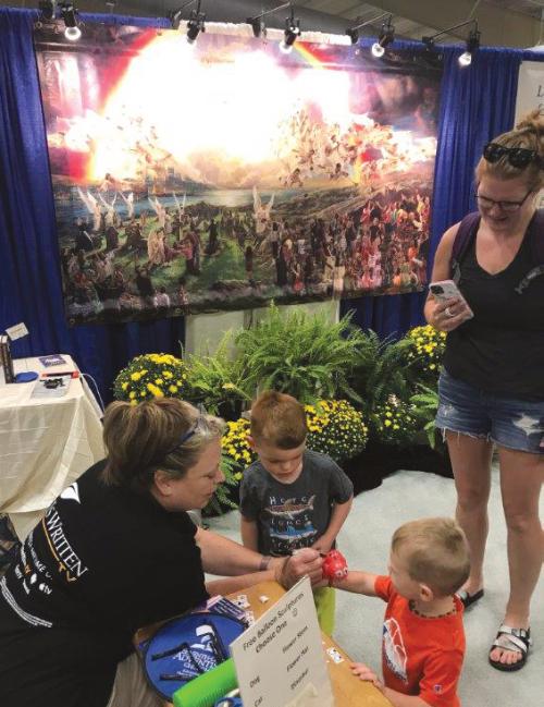 Volunteersenjoygreetingfolksandofferingfreematerials. In addition toBibles in English and Spanish, other materialsgiven away include The Great Controversy, Steps to Christ, Bible Answers, Hacksaw Ridge, and many Amazing Facts and Vibrant Life magazines. Glow tracts, bookmarks listing area SDA churches, materials from It Is Written, DVDs, tracts about a plethora of health and Bible subjects, and Bible study invitational cards are also available – all given for free. Local churches also share upcoming visitorfriendly events through fliers. All of these materials can be carried in a provided bag with the SDA logo on it. A signature draw to the booth are the free twisty balloon creations, coloring pages, kid magazines, and inspirational stickers given to kids!There is a daily drawing with interest cards to see what people are interested in (Bible studies, prayer requests, etc.). Church members always follow up with these interests, being a springboard for many Bible studies. Other Christian denominations working at the fair are excited to receive many of the materials, especially on Bible prophesy. One non-SDApastor said he uses them in his sermons!