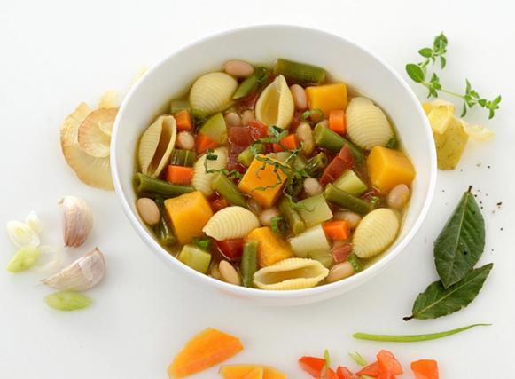 Follow the prep technique next to each ingredient. In a medium size stock pot add olive oil and sauté the celery, onions, carrots, garlic and bay leaf. Fold in the potatoes, butternut squash, green beans, pasta, northern beans and tomatoes with the vegetable broth. Bring the soup to a gentle boil, cover and lower the heat to a low simmer, cook for 15 minutes. Add the rest of the ingredients and simmer until squash is tender but firm.
