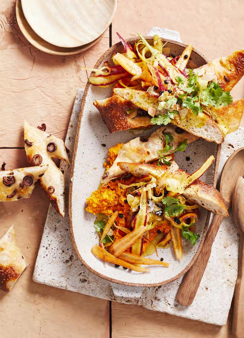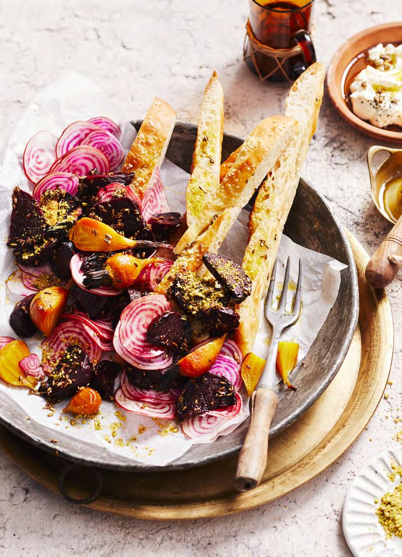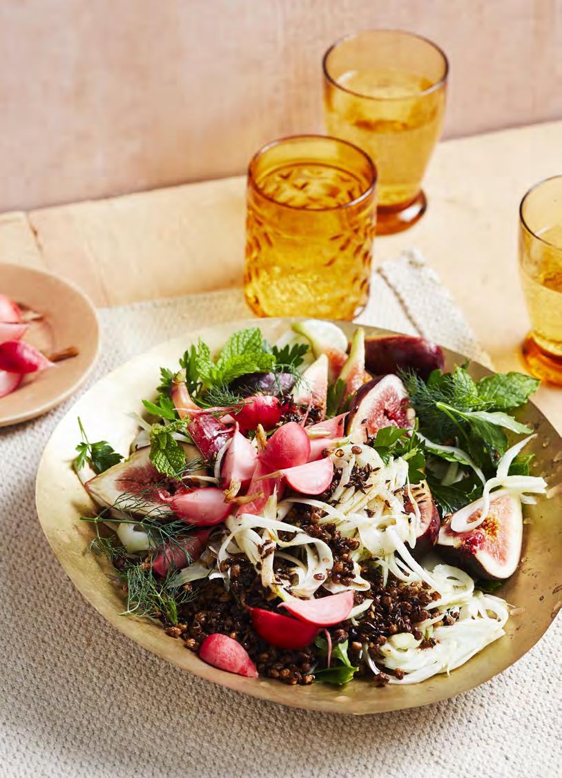 sumac root vegetables with lentils, pickled red onion & mint dressing 26