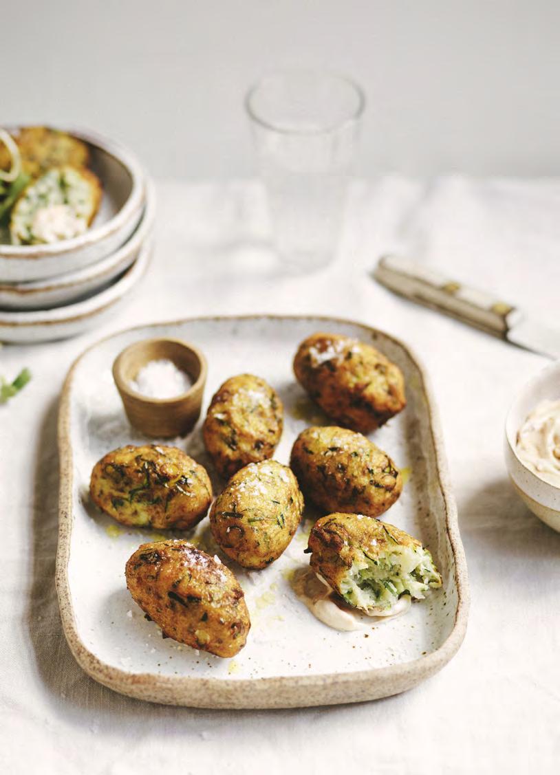 3 Place the grated zucchini in a clean tea towel; squeeze over a sink to remove excess moisture. Combine zucchini, chilli, lemon rind, green onion, mashed potato and rice flour in a large bowl; season. Shape ¼ cups of zucchini mixture into ovals to make 12 in total.