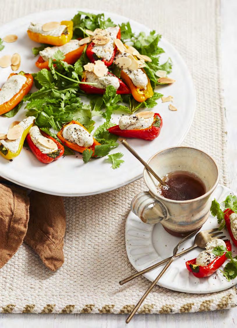 5 Arrange capsicum on a serving platter; pipe even amounts of cheese mixture into each half. Top with almonds and serve with herb salad. Sprinkle with extra toasted za’atar.