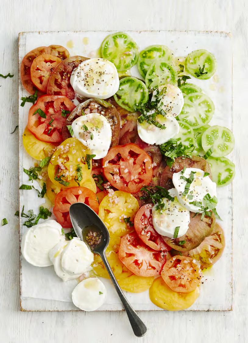 900g heirloom tomatoes, sliced 500g buffalo mozzarella, sliced ½ cup basil leaves, sliced thinly